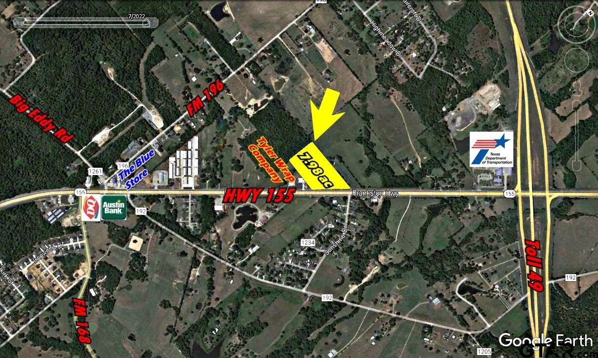| Nice level acreage with over 585' of HWY 155 Frontage, Seller currently has a lease with Winslow's Metal Buildings for a portion of the front property. Septic, water and electric are all on a portion of the property from previous mobile home. This location has over 22K cars pass by daily so with its close proximity to Toll Road 49 and Tyler, this will make for an excellent location for any commercial type business. A portion on the front property sits within the Noonday City Jurisdiction so any Buyer should check with them for any zoning requirements. The entire back portions do not have any zoning or restrictions on them. | |
