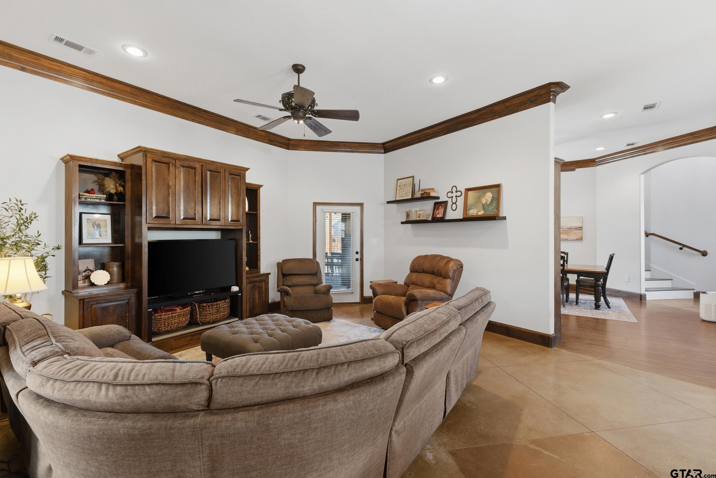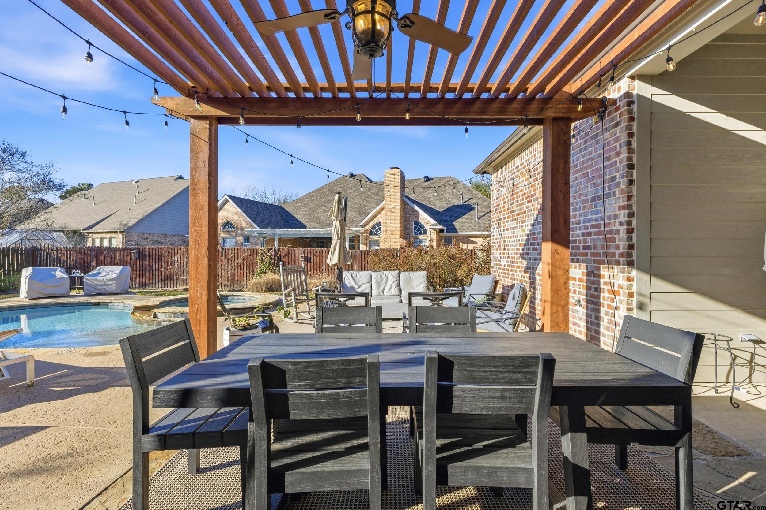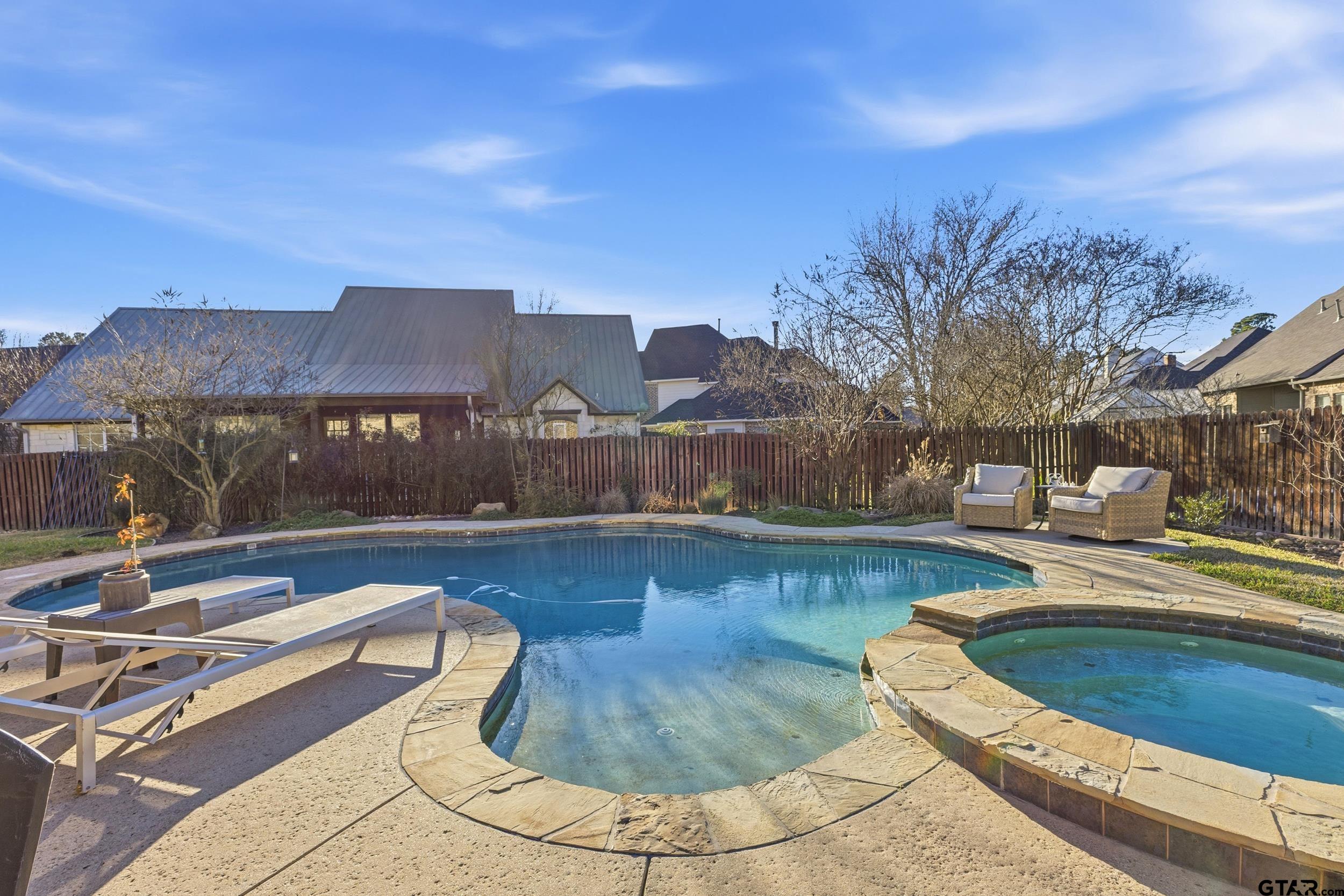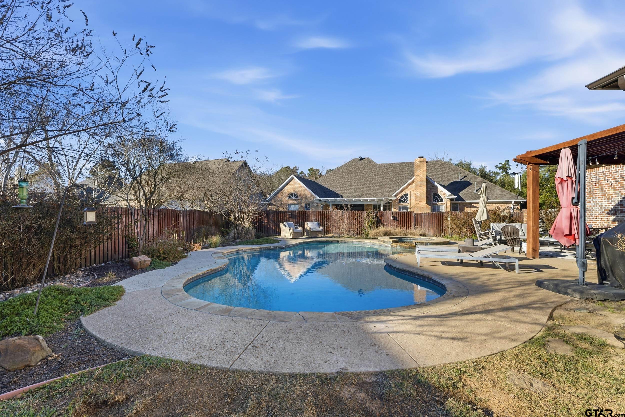 | Nestled in the exclusive Woods subdivision near UT Tyler, this stunning 4-bedroom, 2.5-bath home offers exceptional space, craftsmanship, and thoughtful design on a beautifully landscaped .303-acre lot. Step inside to soaring ceilings, elegant double- and triple-stacked walnut stained molding, and an open-concept layout designed for both everyday living and entertaining. The massive gourmet kitchen is the heart of the home, featuring an expansive island, abundant cabinetry, and extensive storage—perfect for hosting or casual gatherings. The main living area flows seamlessly to a charming downstairs reading or sitting room, ideal for a home office, library, or flex space. Upstairs, one oversized bedroom is large enough to function as a combined bedroom and second living area, game room, or retreat. Outdoors, enjoy a private backyard oasis with a sparkling pool, covered porch, and pergola—perfect for relaxing or entertaining year-round. Additional features include central vacuum, security alarm, sprinkler system, tall ceilings throughout, generous storage, and extra storage space in the garage. New HVAC units installed in February! A rare opportunity to own a beautifully detailed home in one of Tyler’s most sought-after neighborhoods—just minutes from UT Tyler, shopping, and dining. | |